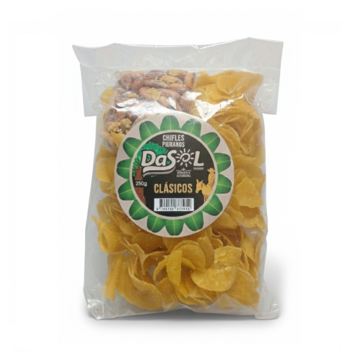 - Chifle clasico con cancha de 250 gr de la marca DASOL de Piura destaca por su calidad, sabor y origen peruano. Un producto natural ideal para complementar una dieta saludable y equilibrada.